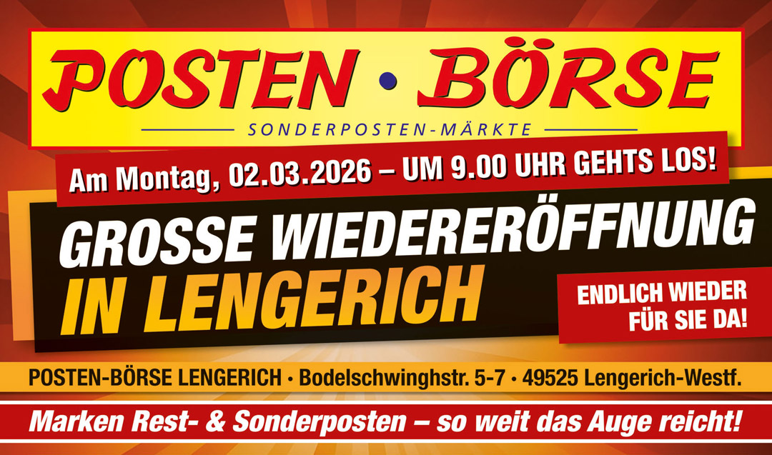 Auch im 30. Jubiläumsjahr wächst die POSTEN-BÖRSE weiter: Durch die fulminante Neueröffnung der 81. Filiale in Hille bei Minden (NRW) sind wir noch näher bei unseren Kunden in der Region.